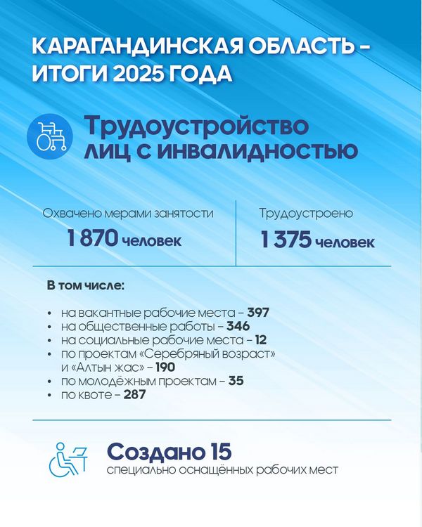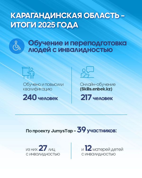 В области развивается профессиональная подготовка людей с инвалидностью. Они осваивают рабочие специальности — от швеи и электрика до сварщика и автослесаря. Жители проходят онлайн-обучение на платформе Skills Enbek. В рамках проекта JumysTap в Караганде и Темиртау открыты консультационные пункты, где без долгих процедур помогают с обучением и трудоустройством. Краткосрочные курсы также проходят матери, воспитывающие детей с инвалидностью.