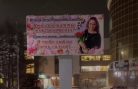 На плакате написано следующее: «Прости меня, любимая! Я тебя люблю очень сильно!». На самом баннере фото женщины, которая в руках держит тюльпаны.