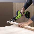 Greenworks предлагает сразу две модели сабельных пил - GPT-CRS-25 и GPT-BLRS-1. Первая – ультракомпактная и предельно лёгкая (всего 1,7 кг), с ходом штока 26 мм, несмотря на свои «несерьёзные» размер и вес, позволяет пилить древесину на глубину до 80 мм, легко справляется с профильными трубами 40х40 мм и арматурой диаметром до 8 мм. Эта модель отлично приспособлена для обрезания деревьев – благодаря компактному корпусу и небольшому весу ею легко оперировать в кроне среди густых ветвей, и при необходимости можно уверенно работать, держа её одной рукой.