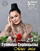 25 лет на сцене: в концертном зале «Шалкыма» 5 мая в 17:00 состоится творческий вечер отличника культуры, лауреата международных и республиканских конкурсов солистки Концертного объединения имени Кали Байжанова Гульмиры Сериккызы «Асыл әнім», сообщает акимат Карагандинской области.