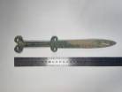 В правой ладони погребённого находилось оружие – металлический цельнолитой двулезвийный акинак, с ярко выраженным ребром жёсткости по центру клинка. Его перекрестие и пятка рукояти украшены фигурным орнаментом – это рога архара и два противопоставленных профиля хищных птиц, причём все это выполнено как единое целое с клинком. Такое сочетание художественного и технологического мастерства, говорят учёные, делает акинак находкой исключительного значения – не только для Центрального Казахстана, но и для всей территории степной Евразии.